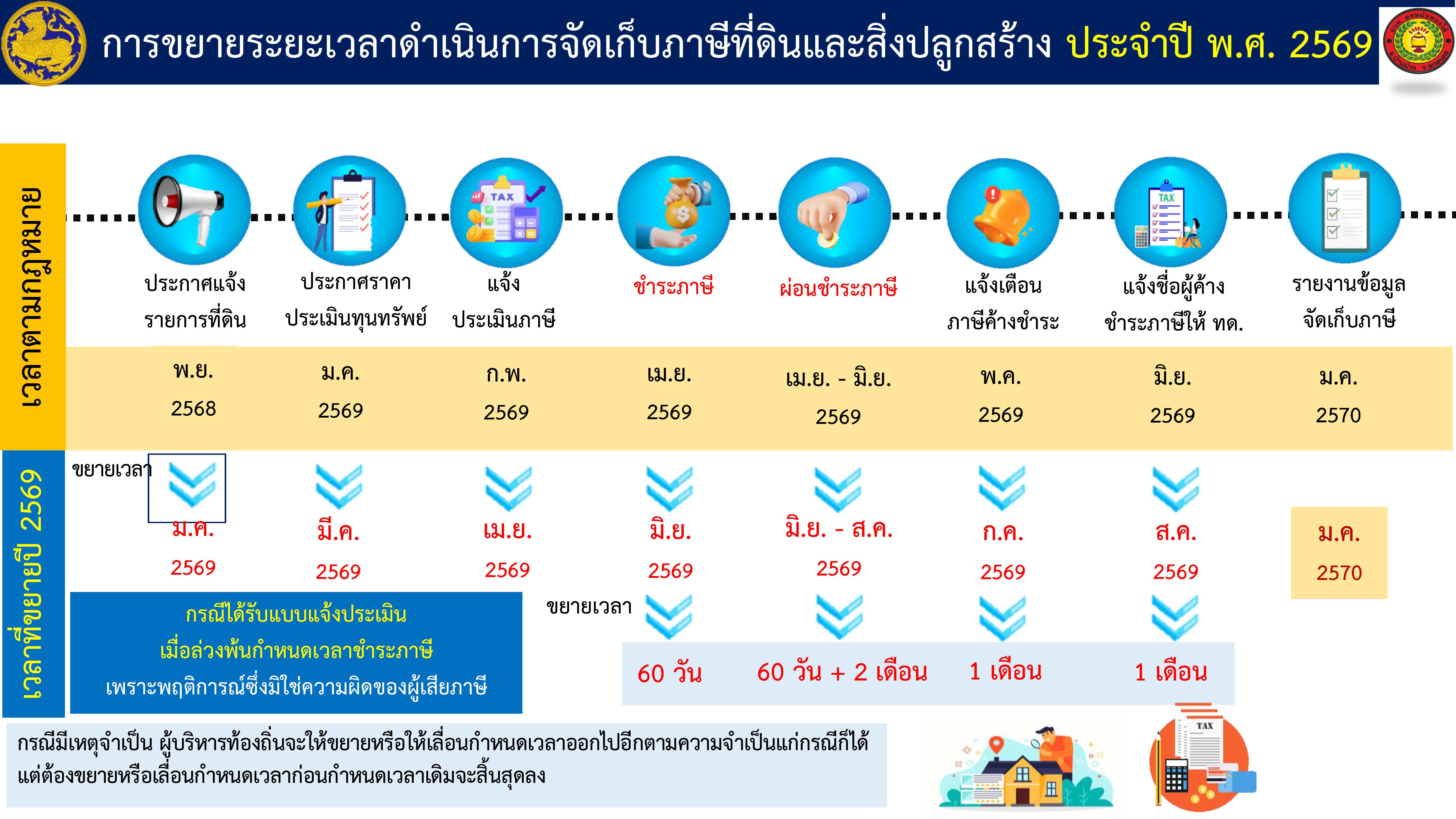 - ขยายระยะเวลาจัดเก็บภาษีที่ดินและสิ่งปลูกสร้าง ประจำปีงบประมาณ 2569